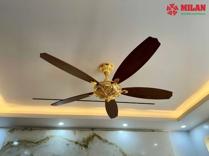 Trung tâm phòng khách là quạt trần mạ vàng FY961. Thiết kế cổ điển tinh xảo kết hợp cánh vân gỗ tạo nên điểm nhấn đẳng cấp, nâng tầm không gian tiếp khách. FY961 không chỉ làm mát hiệu quả mà còn đóng vai trò như một chi tiết trang trí nội thất cao cấp.