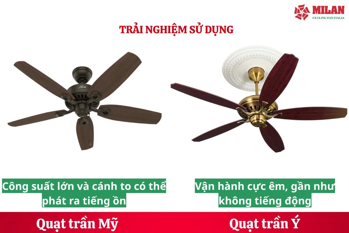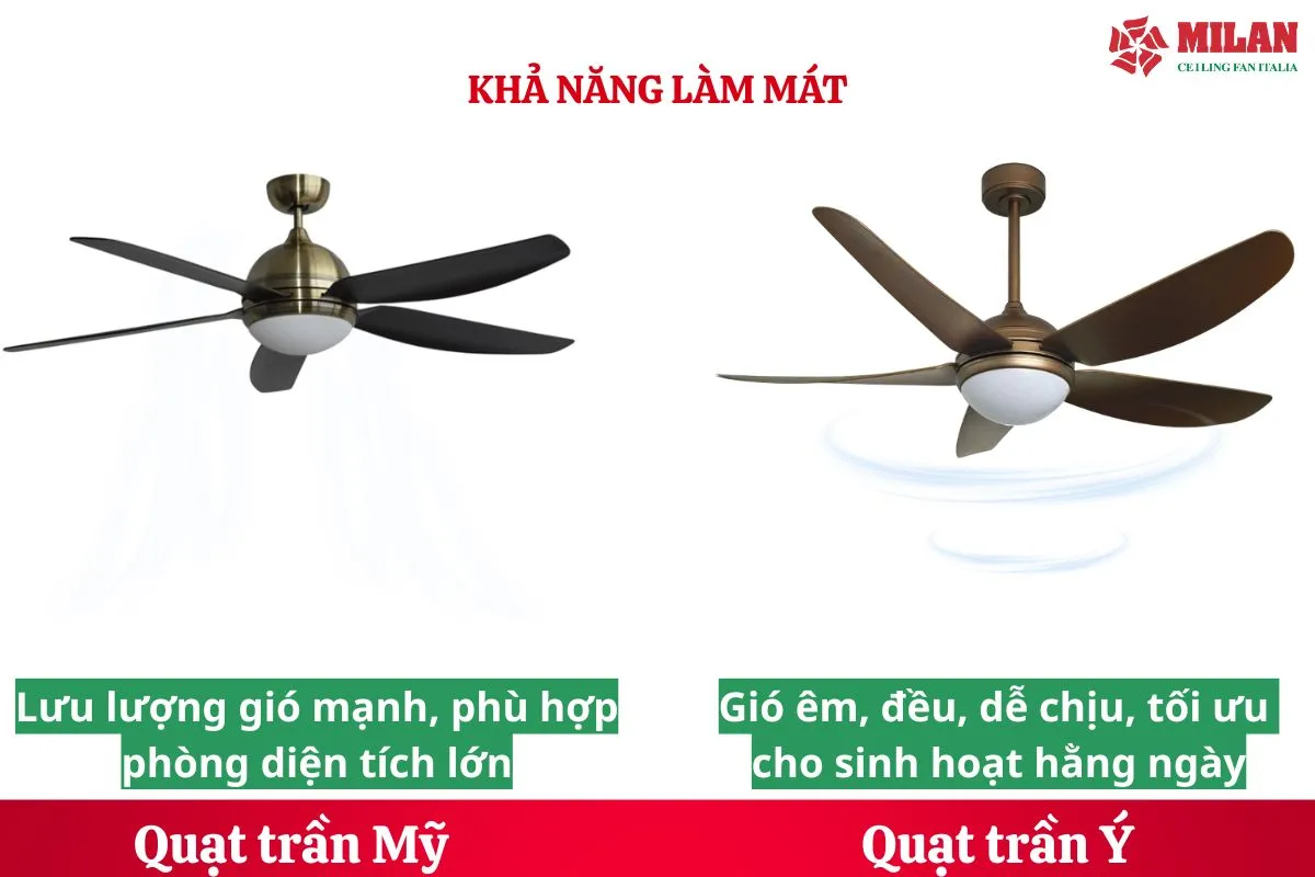 Nếu bạn cần làm mát mạnh cho không gian rất rộng, quạt trần Mỹ có lợi thế. Nếu ưu tiên sự thoải mái, êm ái và tiết kiệm điện, quạt trần Ý chiếm ưu thế.