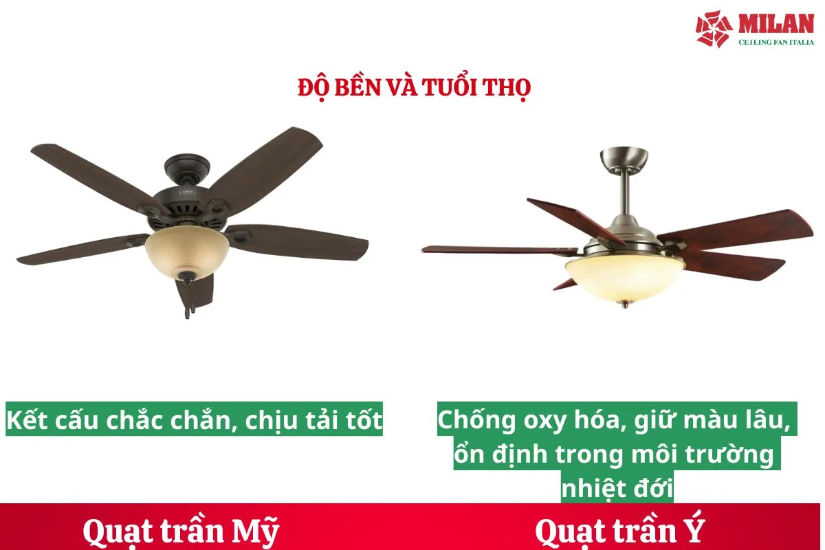 Cả quạt trần Ý hay quạt trần Mỹ đều thuộc phân khúc cao cấp, có độ bền tốt nếu là hàng chính hãng.