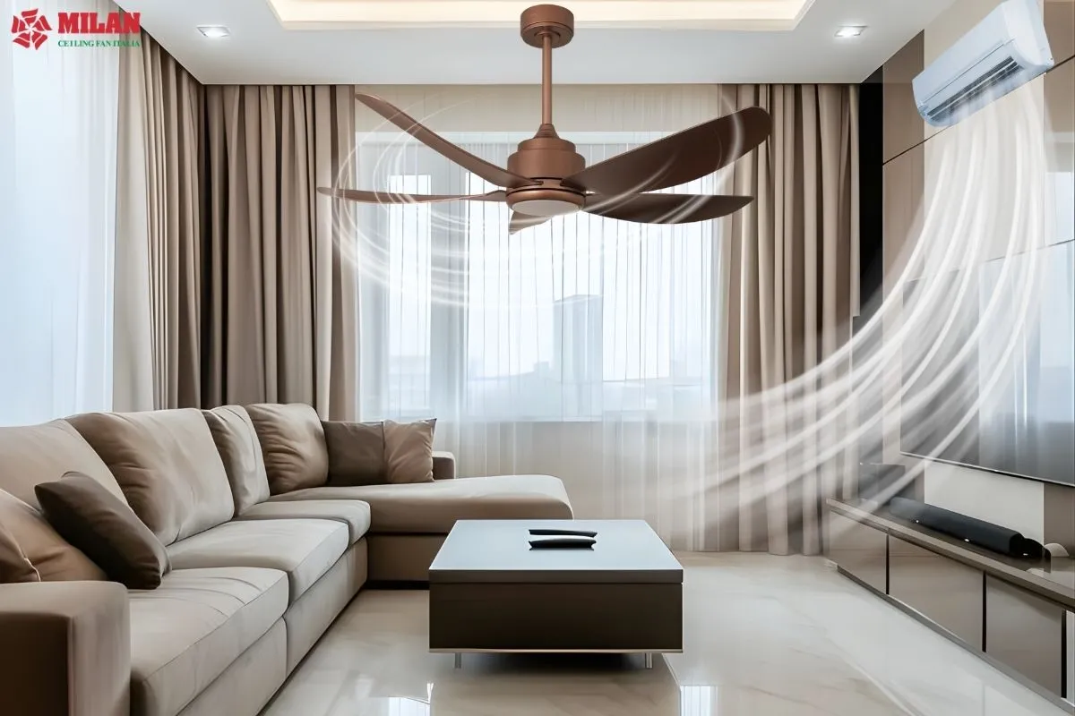 Nếu bạn vẫn đang loay hoay tìm kiếm trời nồm nên làm gì để nhà vừa khô vừa thoáng, câu trả lời chính là sử dụng quạt trần có chức năng đảo chiều. Đây là giải pháp xử lý khí quẩn và độ ẩm cực kỳ thông minh của Milan.