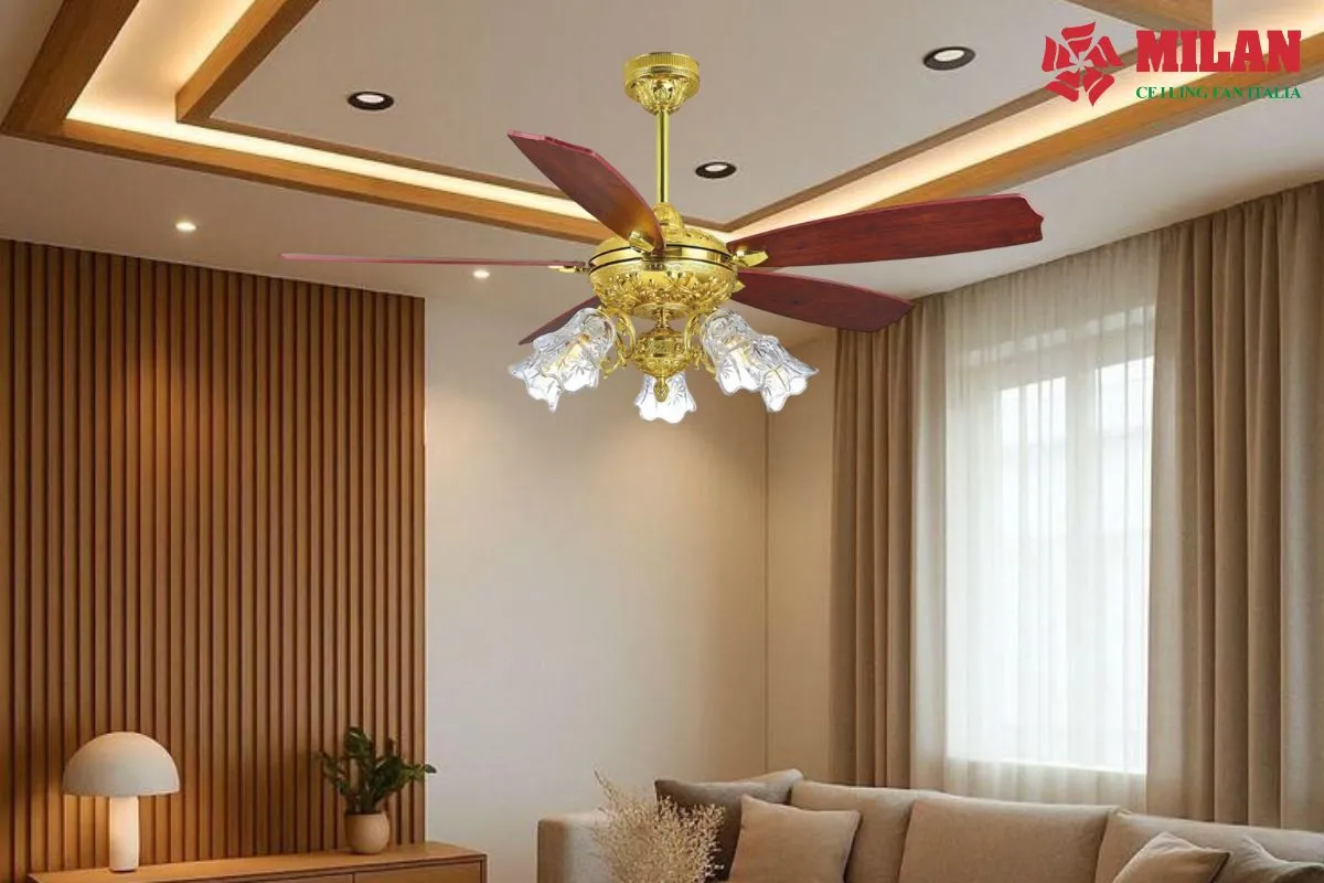 Lớp mạ vàng không chỉ tạo hiệu ứng thị giác nổi bật mà còn giúp bề mặt quạt bền màu, chống oxy hóa tốt theo thời gian. Khi kết hợp cùng đèn trang trí, quạt trần mạ vàng trở thành điểm nhấn trung tâm, nâng tầm đẳng cấp cho toàn bộ không gian.